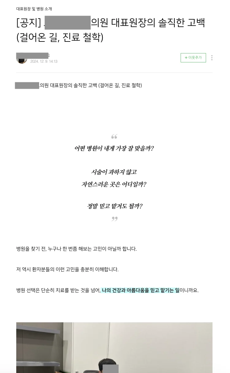 - 진료 철학, 시술 기준, 장비 선택 이유까지 자연스럽게 담습니다.